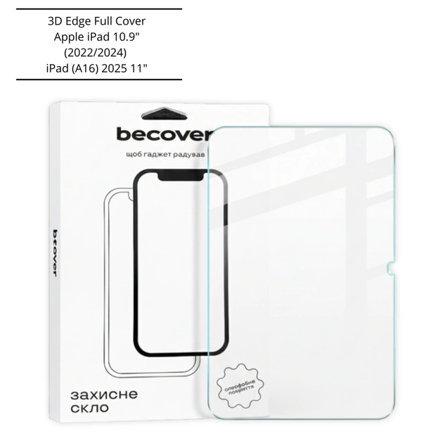 "Преміальне загартоване скло 3D Edge Full Cover створене спеціально для нової лінійки iPad. Завдяки точному 3D-закругленню країв та повному покриттю екрану, скло максимально точно повторює форму дисплея, забезпечує комфорт під час використання та надійний захист від подряпин.