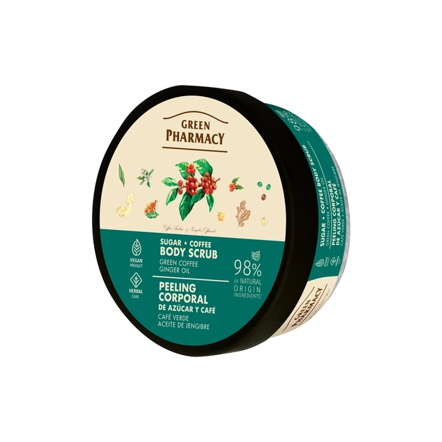 Насолоджуйтеся делікатним доглядом і приємним масажем разом із цукрово-кавовим скрабом для тіла «Зелена кава та імбирна олія» бренда «Зелена Аптека».