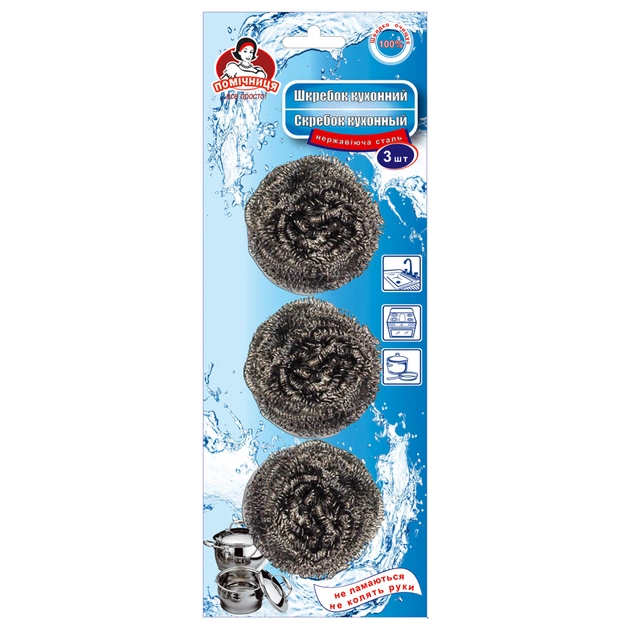 Кухонний шкребок для посуду Помічниця виготовлений із нержавіючої сталі. Швидко та якісно очищає сильно забруднені поверхні. Призначений для каструль і сковорідок без тефлонового покриття. Також використання шкребка актуальне у догляді за мийками, плитами та іншим кухонним приладдям. Переваги товару: