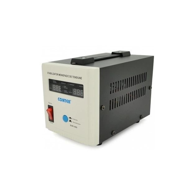Conter CR-SVR-500 є однофазним пристроєм із можливістю роботи в широкому діапазоні вхідних напруг від 150V до 270V. Це робить його відмінним вибором для використання в умовах, де існують часті перепади напруги. Пристрій оснащений двома зручними вихідними роз'ємами Schuko, що дозволяє легко під’єднати різноманітну побутову техніку. Для підключення до мережі 220В використовується стандартна вилка.