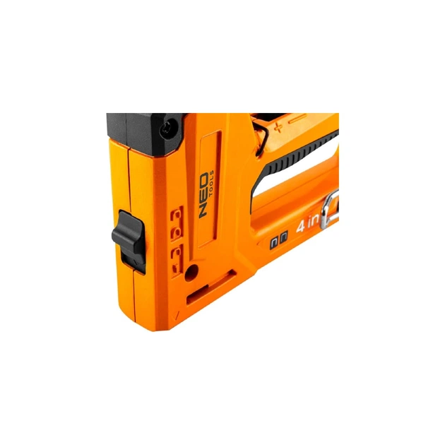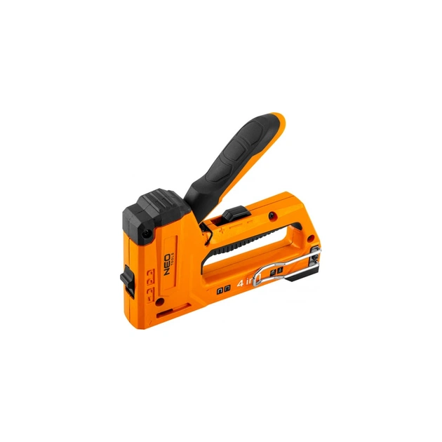 Степлер будівельний Neo Tools алюмінієвий, 4 в 1, 6-14 мм, тип скоб J, G, L, E, регулювання забивання скоб (16-030)