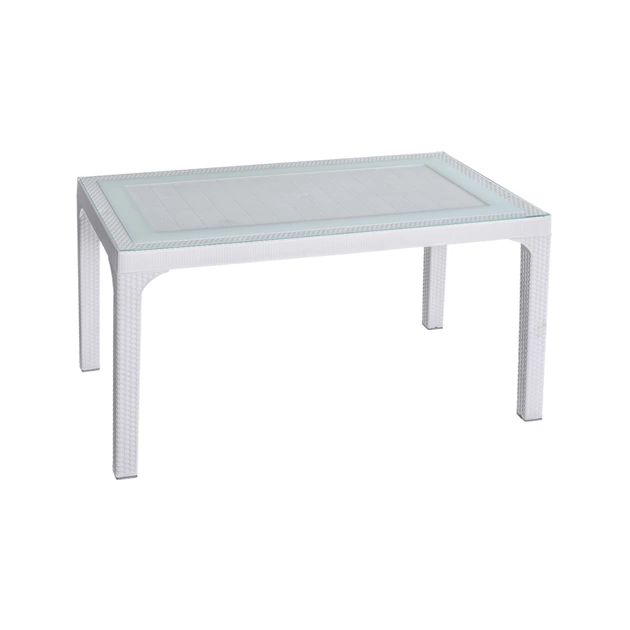 Стіл Irak Plastik прекрасно доповнить садову ділянку або літню терасу. Фактура ніжок з імітацією плетіння під ротанг гармонійно поєднується з поверхнею стільниці, надаючи столу стильний зовнішній вид. Верх стільниці покритий загартованим склом, каркас виконаний з поліпропілену. По кутах стільниці є захисні накладки. Матеріали стійкі до перепадів температур, впливу вологи, УФ-випромінювання. Збереже відмінний зовнішній вигляд і бездоганну якість протягом усього терміну служби. За столом зручно можуть розташуватися шість чоловік. Стіл призначений для використання всередині приміщення і на вулиці.