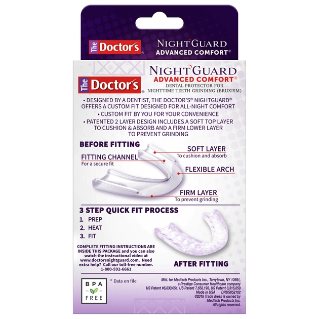 - Запатентована двошарова конструкція призначена для зменшення пошкодження зубів та зниження шуму, що виникає при скреготінні зубами.