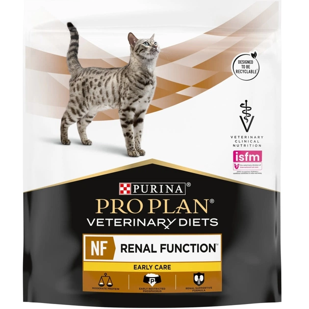 Pro plan veterinary diets nf early care - сухий повнораціонний дієтичний корм для дорослих котів, для підтримання функції нирок при хронічній хворобі нирок на ранніх стадіях. З помірним вмістом високоякісного протеїну та обмеженим вмістом фосфору. Помірна кількість високоякісного білка допомагає підтримувати функції нирок на ранніх стадіях захворювання та допомагає підтримувати достатню м'язову масу. Раннє обмеження рівня фосфору допомагає уповільнити прогресування хронічної ниркової недостатності. Додавання омега-3 жирних кислот, калію та антиоксидантів допомагають у ранньому лікуванні нирок. Корм для котів Pro plan veterinary diets nf early caree має високу смакову привабливість для тварин зі зниженим апетитом.