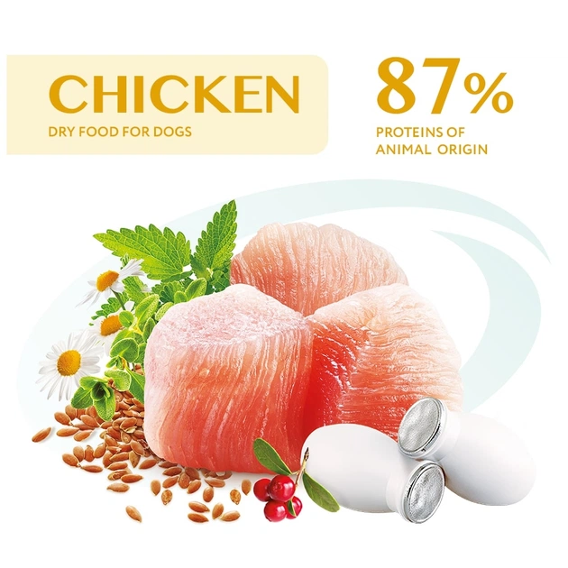 Склад корму надзвичайно добре збалансований, багатий на високоякісні білки із свіжого м'яса курки. Ці білки сприяють оптимальному розвитку та зміцненню м'язів вашого улюбленця. Унікальна формула містить природні джерела глюкозаміну та хондроїтину, які турбуються про здоров'я суглобів, що є особливо важливим для великих порід.