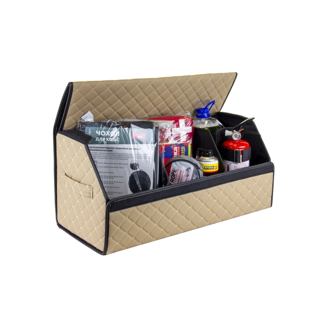 Органайзер EVAtech ECO легкий і зручний у використанні, швидко складається і фіксується на міцні липучки. Всередині з обох боків вшиті резинки для фіксації речей, ззовні по бокам сумка оснащена двома ручками для зручного транспортування. Додатково використано систему липучок на дні та збоку для надійної фіксації органайзера у багажнику.
