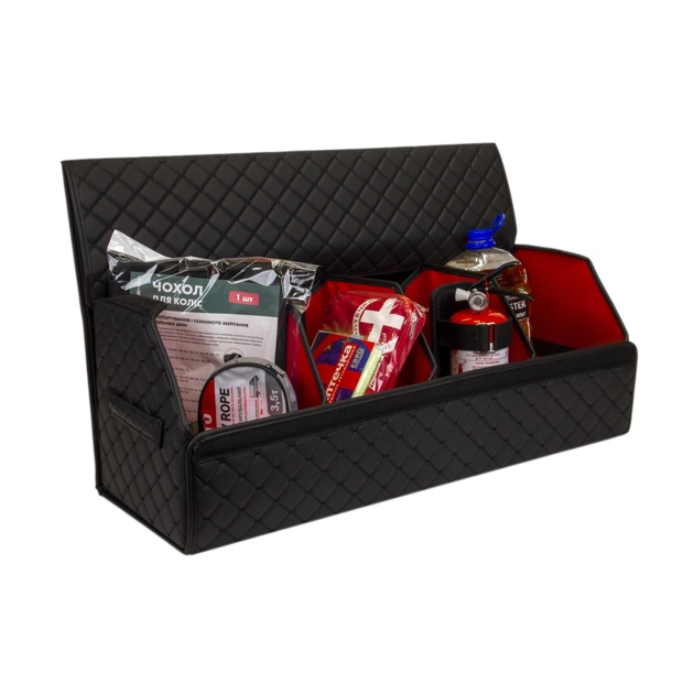 Органайзер для авто EVAtech ECO XL — зручно зберігайте всі необхідні речі, організувавши і звільнивши простір у багажнику. Розбірна конструкція Органайзер у багажник виконаний з матеріалів, що мають водовідштовхуючі властивості. Чорний колір органайзеру та підкладу у поєднанні зі шкіряною текстурою та армуючими нитками мають естетичний вигляд. Для міцності край оброблено чорною стрічкою з екошкіри.