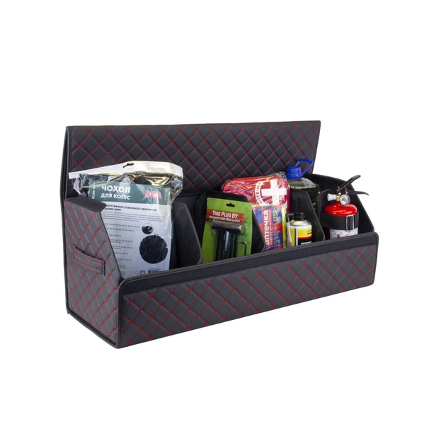 Органайзер для авто EVAtech ECO XL — зручно зберігайте всі необхідні речі, організувавши і звільнивши простір у багажнику. Розбірна конструкція Органайзер у багажник виконаний з матеріалів, що мають водовідштовхуючі властивості. Чорний колір органайзеру та підкладу у поєднанні зі шкіряною текстурою та армуючими нитками мають естетичний вигляд. Для міцності край оброблено чорною стрічкою з екошкіри.
