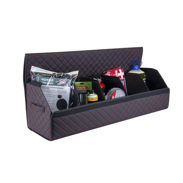 Органайзер для авто EVAtech ECO XXL — зручно зберігайте всі необхідні речі, організувавши і звільнивши простір у багажнику. Розбірна конструкція Органайзер у багажник виконаний з матеріалів, що мають водовідштовхуючі властивості. Чорний колір органайзеру та підкладу у поєднанні зі шкіряною текстурою та армуючими нитками мають естетичний вигляд. Для міцності край оброблено чорною стрічкою з екошкіри.