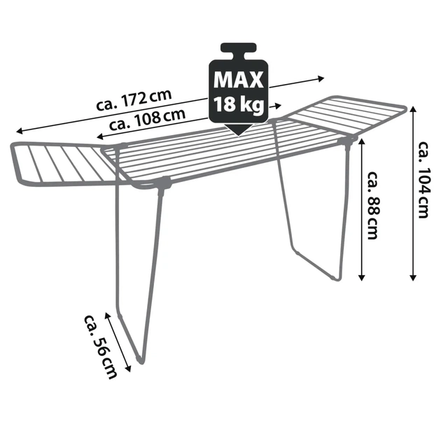 Сушарка має робочу поверхню 18 метрів, що вистачає для сушки білизни після двох циклів прання стандартної п'ятикілограмової пральної машинки. Збільшений діаметр направляючих стрижнів практично не залишає смуг на білизні в процесі сушки. Направляючі стрижні наскрізь проходять через каркас і фіксуються зовні заклепками, саме тому пошкодити їх практично неможливо.