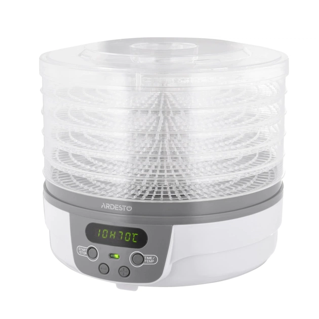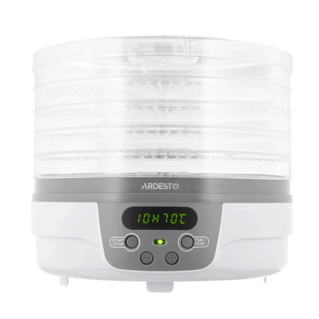ARDESTO FDB-5321T білого кольору із сірою основою. Її кришка з отворами для повітря та п'ять піддонів діаметром 32 см та висотою 3 см – прозорі, що зручно для стеження за процесом сушіння. Температура сушіння регулюється від 40 до 70°С. Управління – електронне, потужність 250 Вт. На всіх рівнях продукти поступово висушуються із збереженням усіх мінералів та вітамінів. Наявність таймера від 1 до 48 год спрощує процес та економить час.
