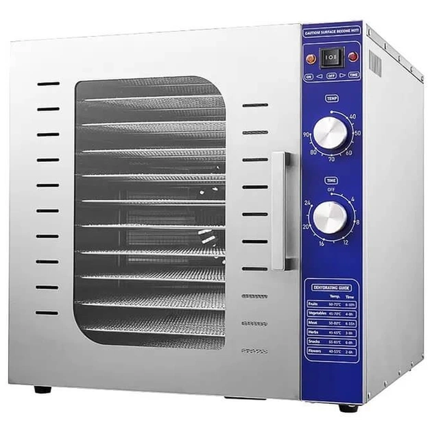 - Температурний діапазон 40–90 °C — ідеальний для інтенсивної сушки овочів, м’яса, фруктів, пастили та заготовок з високим вмістом вологи.
