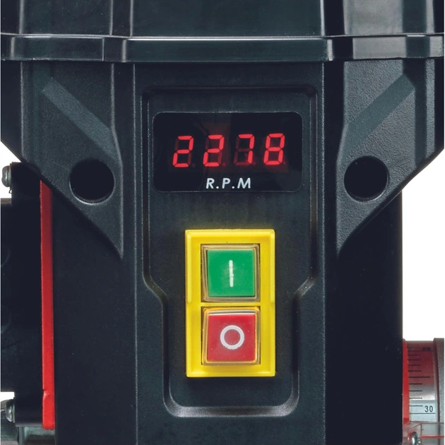 Комфорт використанняРК-дисплей дає змогу користувачеві постійно стежити за поточною швидкістю. Плавне регулювання швидкості не потребує інструментів для налаштування. Високоякісний швидкозатискний патрон легко встановлює необхідне свердло діаметром 0-13 мм. Тихий асинхронний двигун, що плавно працює, забезпечує комфортну роботу. Свердлильний стіл можна регулювати за висотою, нахиляти і повертати для оптимальної роботи. Складаний захисний кожух від стружки з мікровимикачем забезпечує додаткову безпеку користувача. Обмежувач глибини можна відрегулювати для точного свердління під час послідовної роботи, а шпиндель із шарикопідшипниками забезпечує довгий термін служби колонкового свердла.