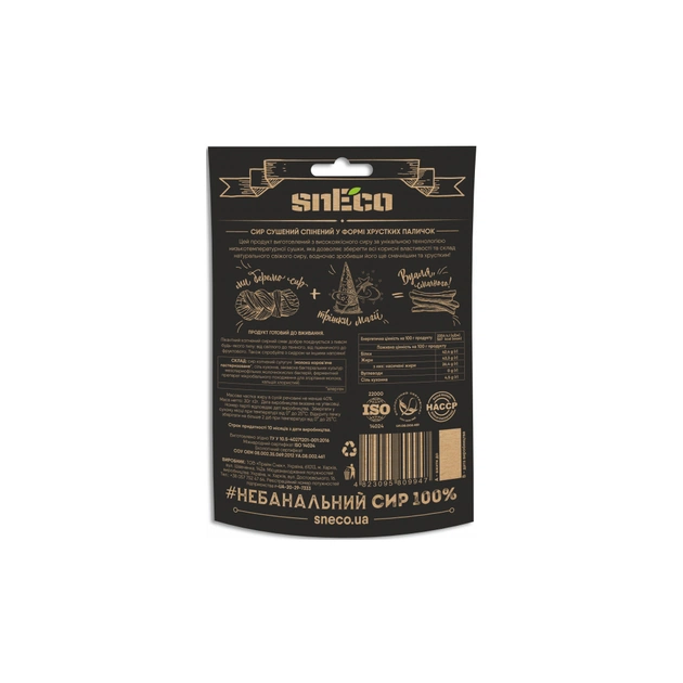 snEco - найхрумкіший сир на планеті! А ще який смачний... Спробуй новий snEco копчений сулугуні з гострим перцем! Духмяний смак "з димком" у тандемі з гостротою та хрустким сиром, це саме те що треба до пива! Його хочется їсти і їсти, тож не забудь про другу пачку! Вироблено по запатентованій технології та трішечки Української любові у кожній пачці.