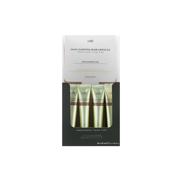 Ефективна кератинова сироватка Snail Sleeping Hair Ampoule від бренда La'dor призначена для застосування вночі, коли волосся найбільш сприйнятливе до активних компонентів. Завдяки біополімерним та амінокислотним сполукам засіб проникає в кортекс волосся і сприяє регенерації пошкоджених ділянок, заповнюючи їх білками, схожими з природним матеріалом волосся. Продукт містить фільтрат муцину равлика та комплекс фітоекстрактів конвалії, едельвейса, індійського лотоса, жасмину, кореня ірису та білої лілії, що робить локони шовковистими, м’якими та блискучими.