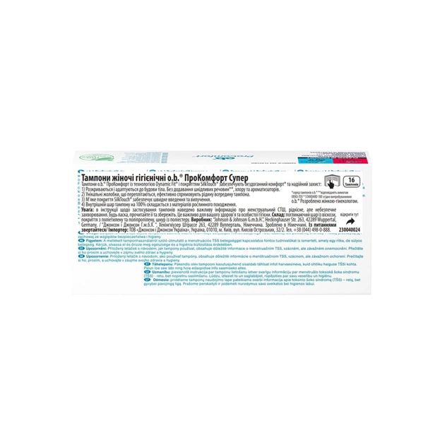 o.b.® ProComfort® забезпечують легке введення і надійний захист завдяки унікальному ** покриттю SilkTouch ™, спеціальним жолобкам і новій технології, для ще більш гладкої поверхні тампона o.b.® ProComfort®. Тампони o.b.® ProComfort®Super краще за все підходять для днів зі середніми та рясними виділеннями. *