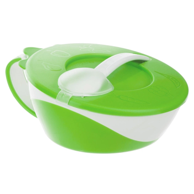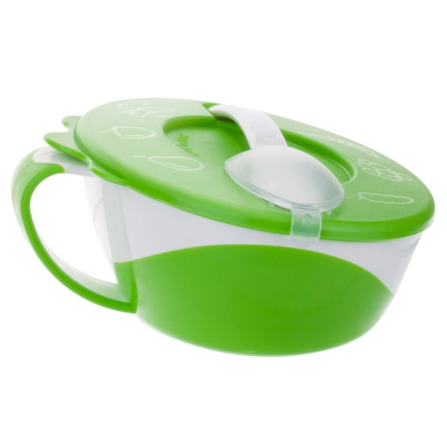 Ця тарілочка незамінний помічник у господарстві для всіх мам, у яких є діти. Щільна кришка допоможе підтримати температуру їжі. А за допомогою ручки ви можете тримати тарілочку в одній руці, а ложку — в інший. Має прогумоване дно. Ложечка має злегка округлену форму, щоб захистити ніжні ясна дитини від подразнення.