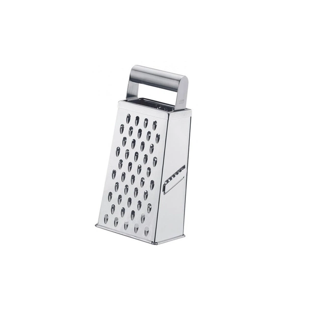 Тертка має чотири сторони для подрібнення продуктів: дрібна, велика тертки, тертка для нарізання скибочками та рифленими скибочками. Тертка скибочками обладнана двостороннім лезом для зручності нарізання в обох напрямках. Зручна металева ручка. Може використовуватися для дрібного, великого тертя та для тертя картоплі.