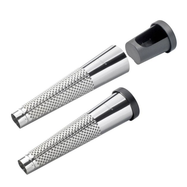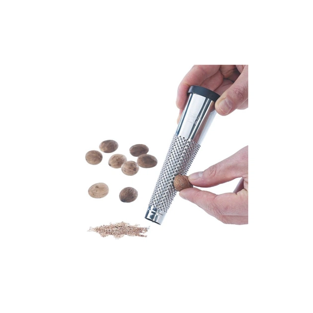 Тертка для мускатного горіха має висувний контейнер для зберігання горіхів із пластику, поверхня тертки виготовлена з нержавіючої сталі.