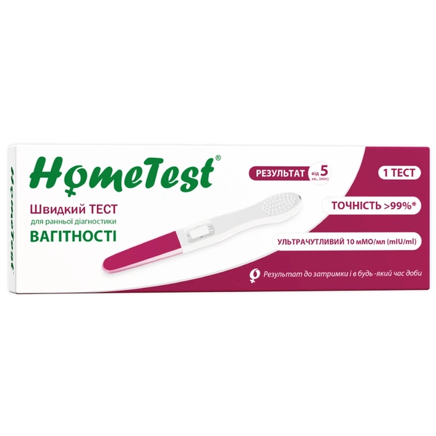 HomeTest струменевий — високочутливий струменевий тест на вагітність 3-го покоління. Завдяки спеціальній конструкції дає змогу тестувати без збору сечі. Це робить процедуру тестування простішою та гігієнічнішою.