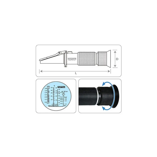 Основна функція цього рефрактометра - вимірювання щільності електроліту в батареї та концентрації сечовFFини в баку AdBlue. Цей процес здійснюється швидко і точно, дозволяючи зберегти час і зусилля під час обслуговування автомобільних систем.
