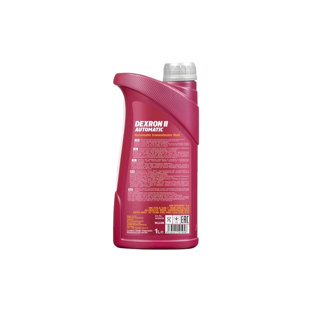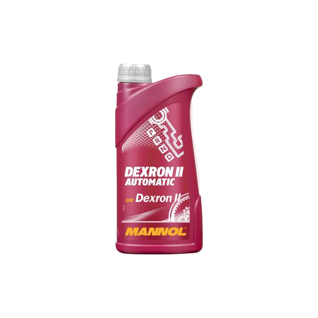 8205 MANNOL Dexron II Automatic - універсальне всесезонне трансмісійне масло (ATF) на мінеральній основі для автоматичних коробок передач, гідравлічних систем рульового управління, пристроїв перекидання кабіни, гідравлічних систем рульового управління, гідравлічних зчеплень автомобілів та інших гідравлічних пристроїв, в тому числі які працюють у важких умовах в вантажних автомобілях і позашляховій техніці. Забезпечує безперебійну роботу АКПП, гарантує мінімальний знос, тривалий термін служби трансмісій і економію палива. Розроблено на підставі вимог концерну GM.