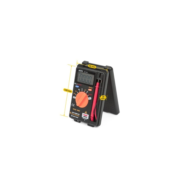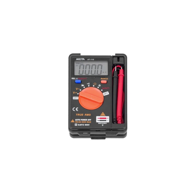 Accta AT-110 – це кишеньковий цифровий True RMS мультиметр з автоматичним вибором діапазону. Використовується для вимірювання постійної та змінної напруги, опору, прогальності, ємності й частоти. Також з його допомогою можна перевіряти діоди та провідність кола. Пристрій живиться від двох батарей типу ААА (1,5 В).