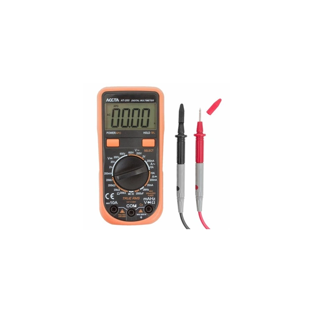 Accta AT-205 — це цифровий True RMS мультиметр, призначений для вимірювання постійної та змінної напруги, постійного та змінного струму, ємності, частоти та опору, а також для перевірки діодів та провідності електричного кола. Оснащений великим 1999-розрядним дисплеєм. Прилад вирізняється високою надійністю й безпекою використання.