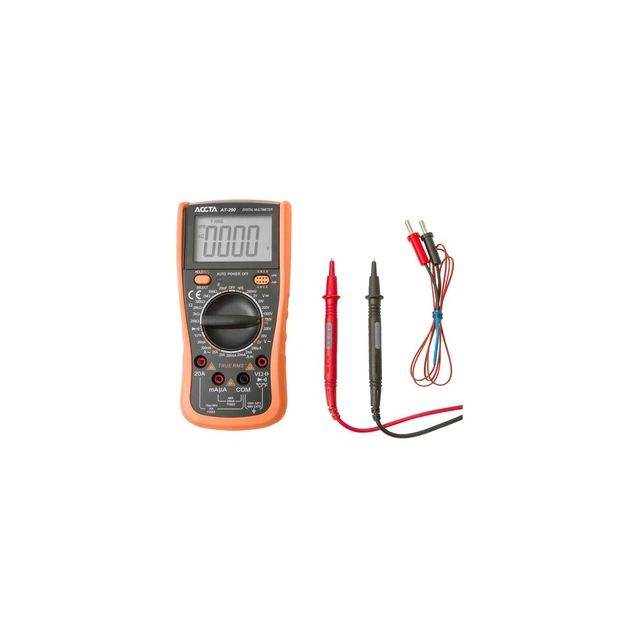 Accta AT-290 — це цифровий True RMS мультиметр, призначений для вимірювання постійної/змінної напруги, постійного/змінного струму, опору, ємностіта температури, а також може бути використаний для перевірки діодів, транзисторів та провідності електричних кіл. Оснащений великим РК-дисплеєм з підсвічуванням. Прилад живиться від 9 В батареї.