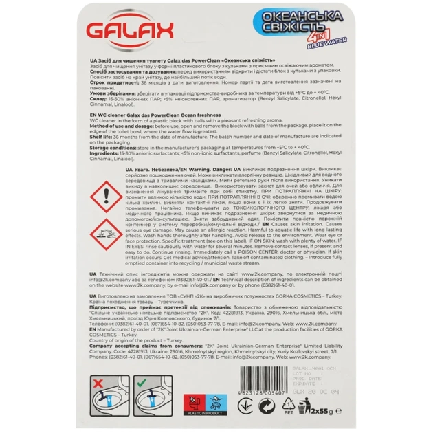 Засіб для чищення унітаза Galax у формі пластикового блоку з кульками з приємним освіжаючим ароматом.