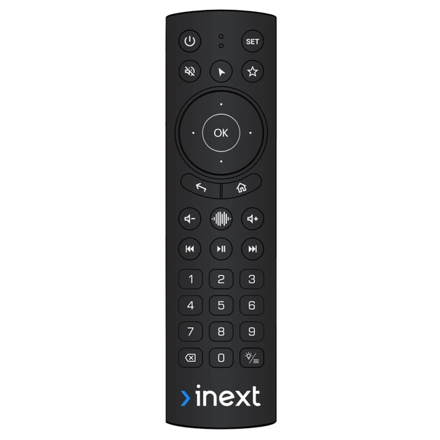 Пульт дистанційного керування iNeXT Air оснащений мікрофоном, тому ви зможете не тільки управляти пристроями, але і здійснювати голосове введення. Пульт дозволить управляти курсором, набирати текст і грати в ігри. Завдяки гіроскопу гра стане більш реалістичною, а управління меню Android приставки буде виконуватися в форматі управління дистанційною указкою. Працює від двох батарейок типу ААА.