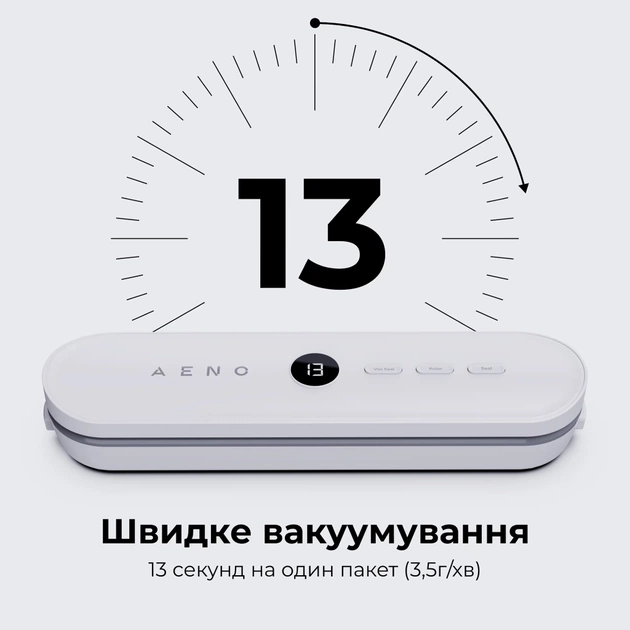 Запаковуйте продукти всього за 13 секунд на пакет. Вакууматор AENO забезпечує потужну роботу зі швидкістю всмоктування 3,5 л/хв, допомагаючи швидко та ефективно пакувати інгредієнти. Ідеально для зайнятих сімей та тих, хто цінує час і свіжість.