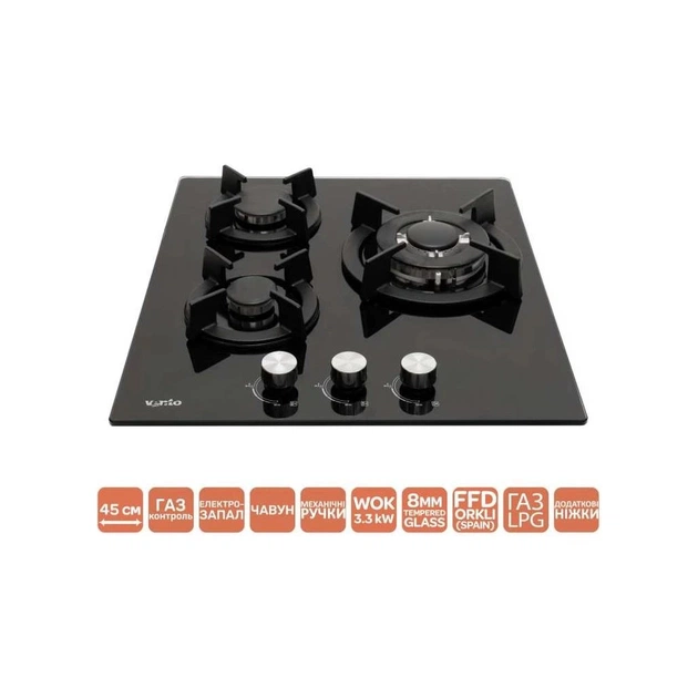 Для забезпечення зручності та ефективності приготування, поверхня оснащена тримома газовими конфорками різної потужності, що варіюється від 1 до 3,3 кВт. Особливу увагу заслуговує велика конфорка з трьома рядами полум'я, яка підходить для таких складних завдань, як швидке доведення до кипіння великих об’ємів води або приготування страв у великій сковороді. Завдяки цьому ви легко зможете готувати одночасно три різні страви, значно економлячи ваш час.