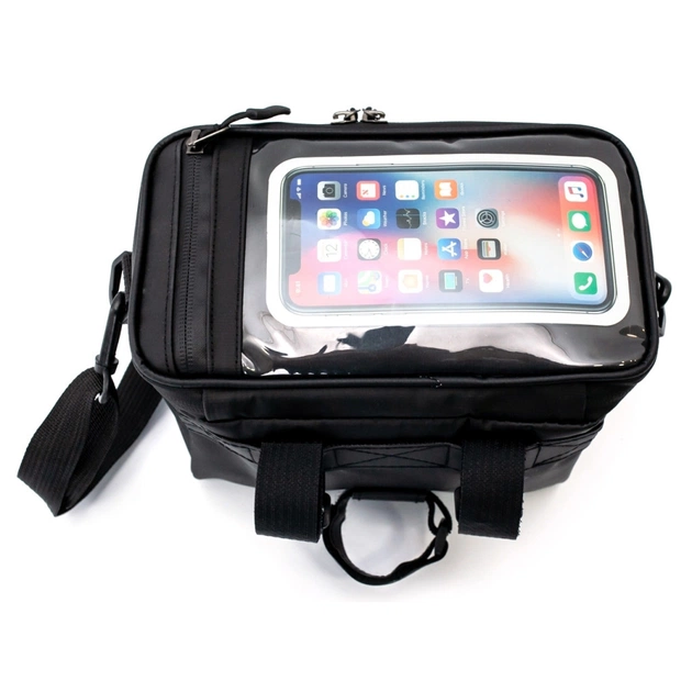 Сумка пошита з вологозахисного матеріалу. Верхнє відділення має прозорий відсік, в який можна покласти смартфон, або навігацію.