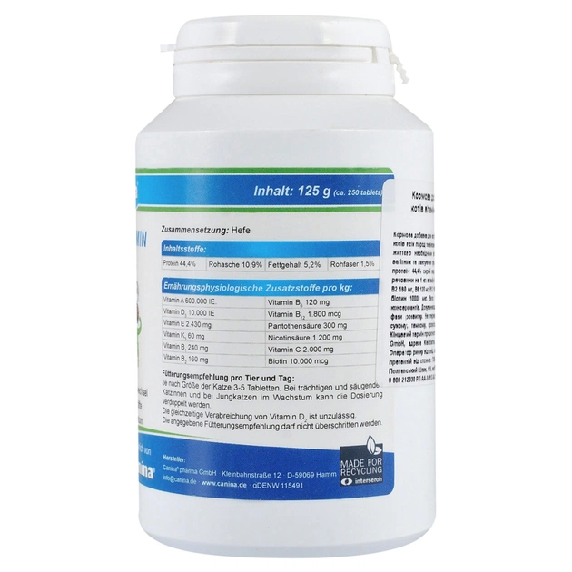 Полівітамінний комплекс Canina Cat-Vitamin в першу чергу призначений для профілактики загальної недостатності поживних речовин. Виробник рекомендує давати його кішкам всіх порід і вікових груп в якості дієтичної добавки до основного корму. Речовина-наповнювач на основі дріжджів має відмінний смак і обов'язково сподобається Вашій тварині. Препарат підвищує опірність і витривалість організму тварини. Особливо це необхідно після хвороби, в жаркий період року або під час лактації.