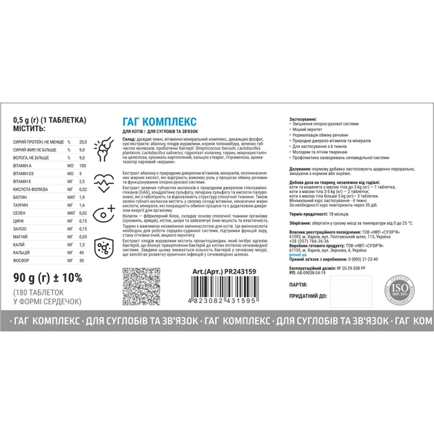 Вітаміни для котів ProVET ГАГ комплекс для суглобів та зв'язок 180 табл. (4823082431595)
