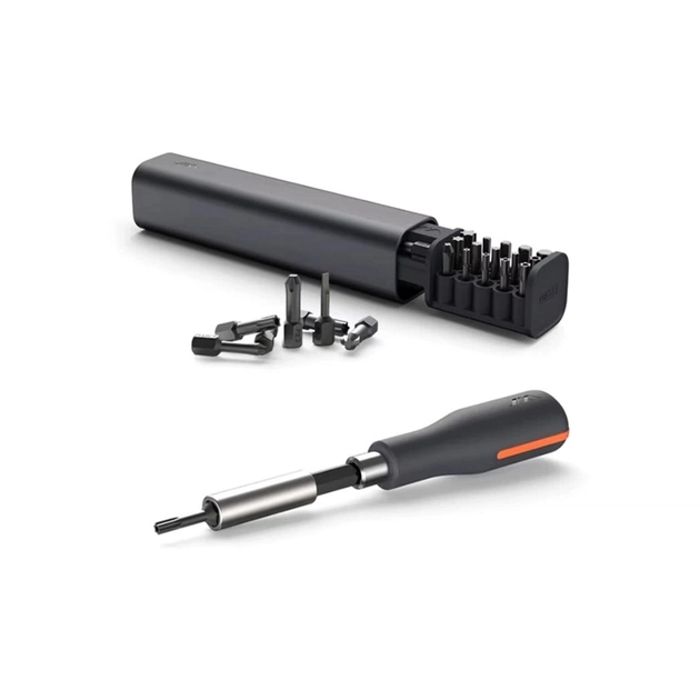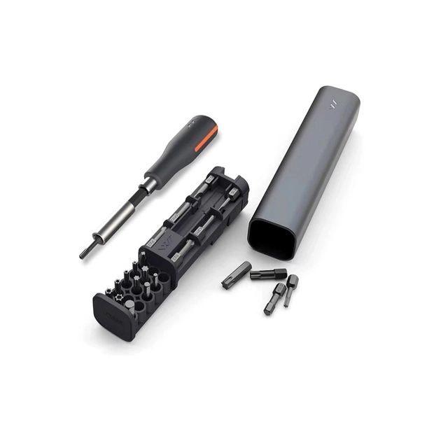 Корпус набору виконаний з анодованого алюмінієвого сплаву, який забезпечує довговічність та захищає насадки від пошкоджень. Внутрішній ящик з ABS-пластику акуратно утримує біти, подовжувальний стрижень та викрутку, запобігаючи їх випаданню. Завдяки компактним розмірам 155 × 35 × 35 мм, інструмент зручно зберігати та носити із собою.