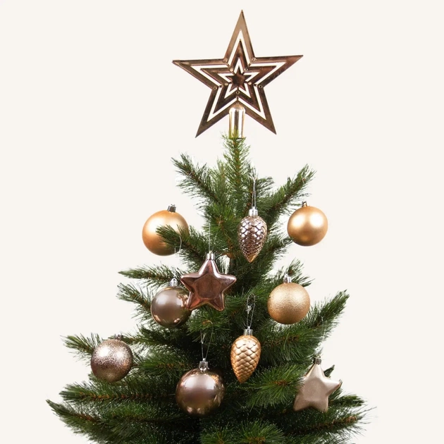 Особливістю набору є різноманіття розмірів (Ø 8/7/6 см), покриттів (матові - 15 шт; глянцеві - 18 шт; рельєфні блискучі - 7 шт) та форм пластикових прикрас, представлених у ніжному персиковому відтінку*, що особливо вдало виглядають на фоні хвої, а також впишуться у будь-який інтер'єр. Крім традиційних кульок середнього та великого розміру, до комплекту входять підвісні шишечки, зірочки та зірка-верхівка на ялинку — що дозволяють чарівно оздобити новорічне дерево у повноцінну святкову композицію. Залишається лише вдягнути іграшки на вашу ялиночку!