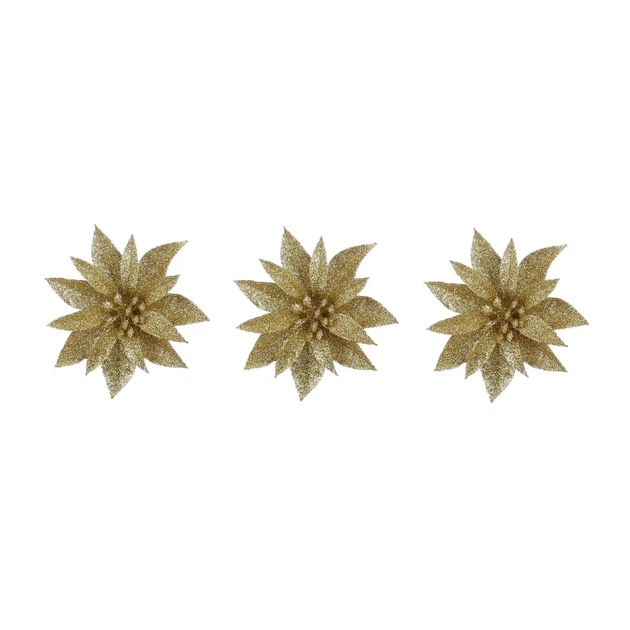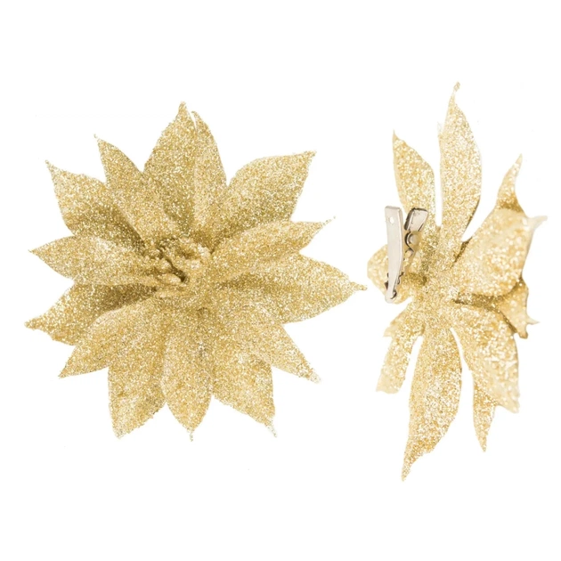 Коли мова заходить про різдвяні свята — новорічного декору багато не буває! Оригінальний варіант оздоблення — виблискуючі золотисті квіточки, що легко кріпляться кліпсою та будуть цікавим акцентом на вашому новорічному дереві або як доповнюючий елемент декорування інтер'єру.