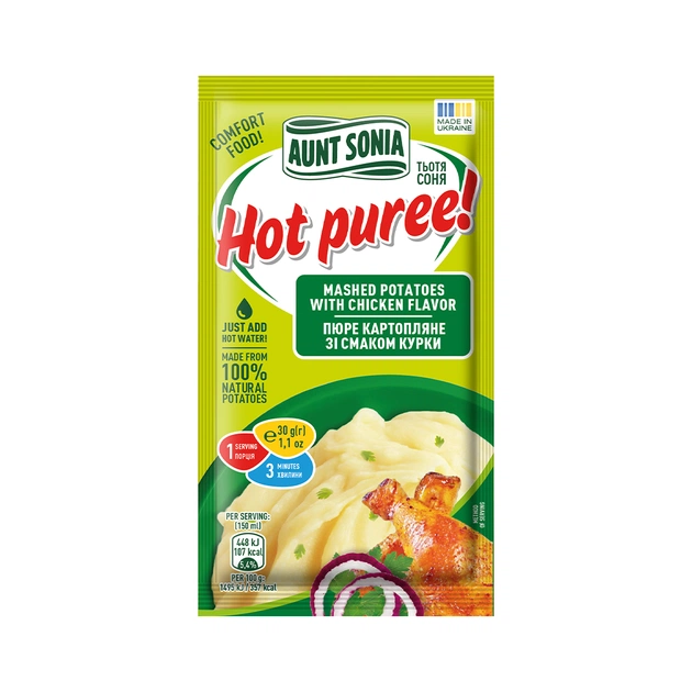 В ньому вже є всі необхідні спеції та сушені овочі. Додайте тільки окріп. Гаряча пюрешка «Тьотя Соня» – обід за мить!