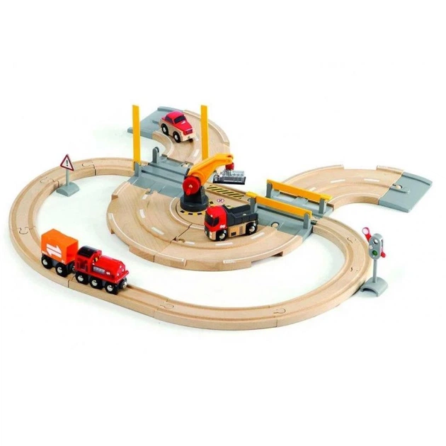 У набір входять секція з краном, світлофор, автомобільне дорожнє полотно, вантажі, легкові і вантажні машини, потяги з вантажним вагоном і залізничне полотно.