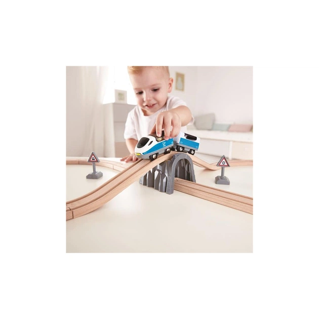 Дерев'яна залізниця Hape з пасажирським поїздом (E3729) складається з 26 елементів. Набір відповідає міжнародним стандартам якості EN 71 і ASTM F963. Рекомендований вік: 3 роки.