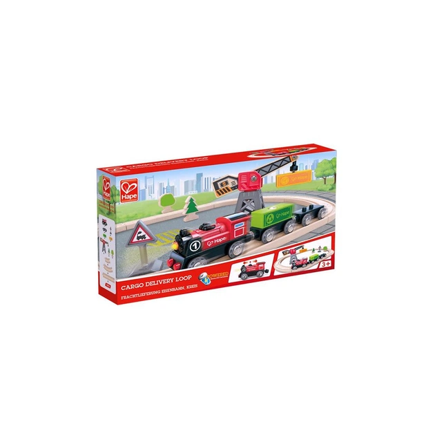 Залізниця Hape Доставка вантажів (E3731) складається з 19 елементів. Набір відповідає міжнародним стандартам якості EN 71 і ASTM F963. Рекомендований вік: 3 роки.