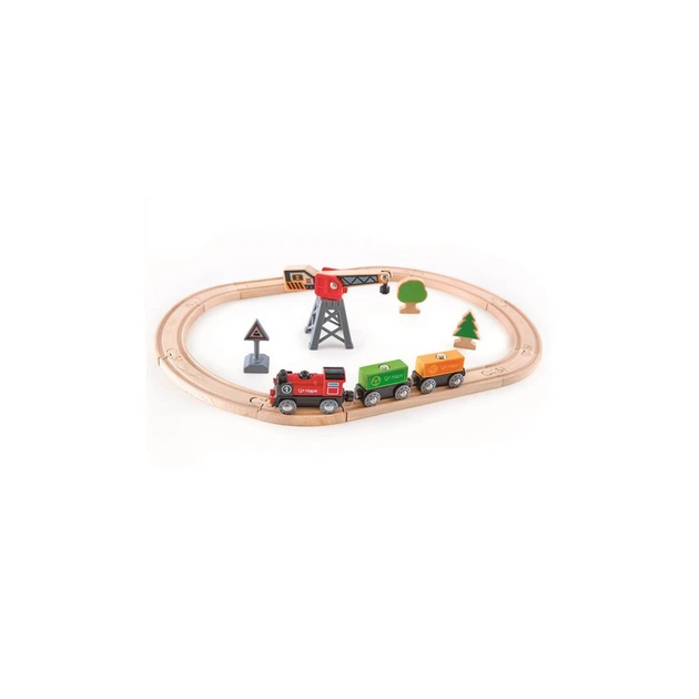 В наборі: рельси, вантажний потяг з 3-х вагонів, кран з магнітною лебідкою, 2 дерева, застережливий знак. Набір сумісний з іншими дерев'яними залізницями від Hape.