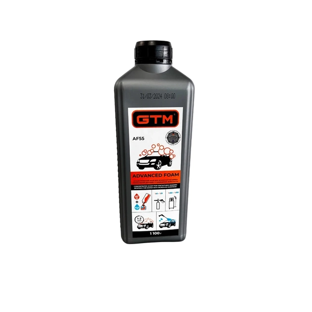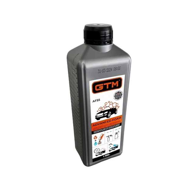 GTM Advanced Foam AF55 - концентрований високопінний засіб для очищення поверхні від усіх видів забруднень, включно з дорожнім пилом, паливним забрудненням або залишками комах. Застосовується для всіх видів безконтактного миття автомобілів, велосипедів і мотоциклів. Надає поверхні блиск без розводів. Піна безпечна для лакофарбового покриття, пластмас, гуми та металів.