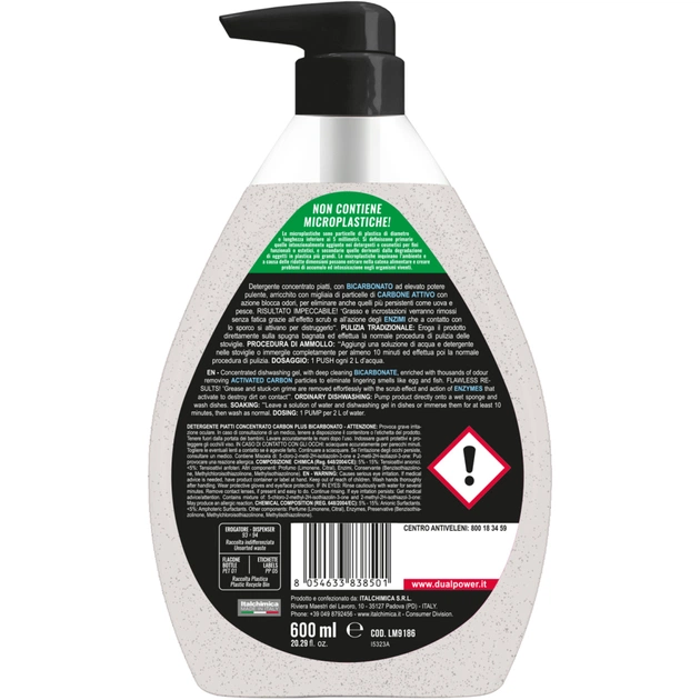Засіб для ручного миття посуду Dual Power Carbon Plus Bicarbonate концентрований 600 мл - це ідеальний вибір для тих, хто цінує якість та ефективність. Створений в Італії, цей універсальний засіб зволожує та очищає ваш посуд, використовуючи силу активованого вугілля та бікарбонату. Концентрована формула дозволяє економно витрачати продукт, утворюючи густу піну, яка дбайливо розщеплює жир навіть у холодній воді.