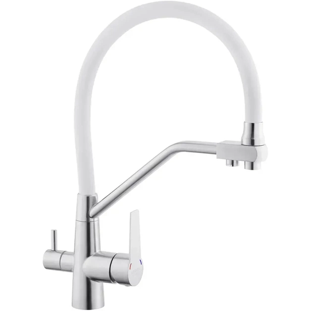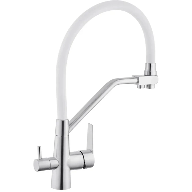 Змішувач для кухні з підключенням до фільтру Kroner KRP Edelstahl Klassisch - ESG03817WHI виготовлений з високоякісної нержавіючої сталі, яка не піддається корозії, стійка до ударів та появи тріщин. Змішувач має U-подібну форму з трьома контурами підключення води. За участю першого та другого здійснюється підключення холодної та гарячої води, де змішування відбувається за допомогою картриджа.