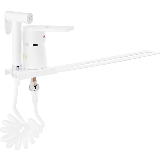 Завдяки білому матовому покриттю має оригінальний вигляд. Вироблений у сучасному стилі зі зручним важелем для змішування води, а також компактним душовим гарнітуром у складі однорежимного гігієнічного душу та душового шланга в полімерному обплетенні.