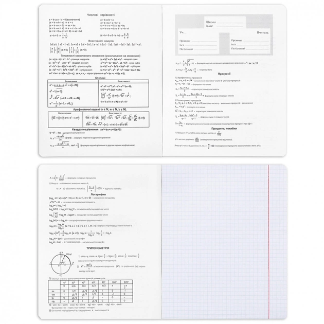 Алгебра - містить основні формули, теореми правила, які допомагають учням у вивченні алгебри. А також має всередині корисні шпаргалки на предмет;