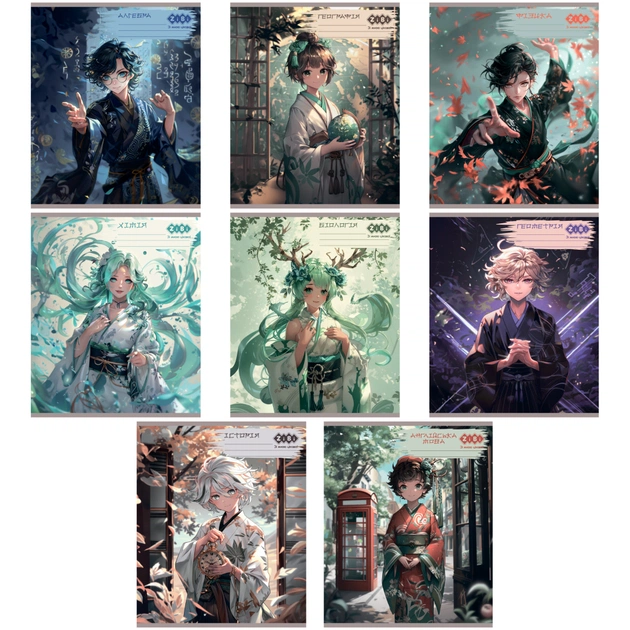 Набір містить 10 зошитів з 8 предметів: алгебра – 2 шт, геометрія – 2 шт, фізика – 1 шт, хімія – 1 шт, біологія – 1 шт, географія – 1 шт, історія України – 1 шт, англійська мова – 1 шт.